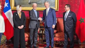 كما أبرز إرادة المملكة المغربية، تحت القيادة المتبصرة لجلالة الملك، العمل مع الشيلي من أجل تعزيز وتمتين علاقات الصداقة المتميزة القائمة بين البلدين، وتطوير التعاون الثنائي في مختلف المجالات، بما يخدم مصالح الشعبين الصديقين.